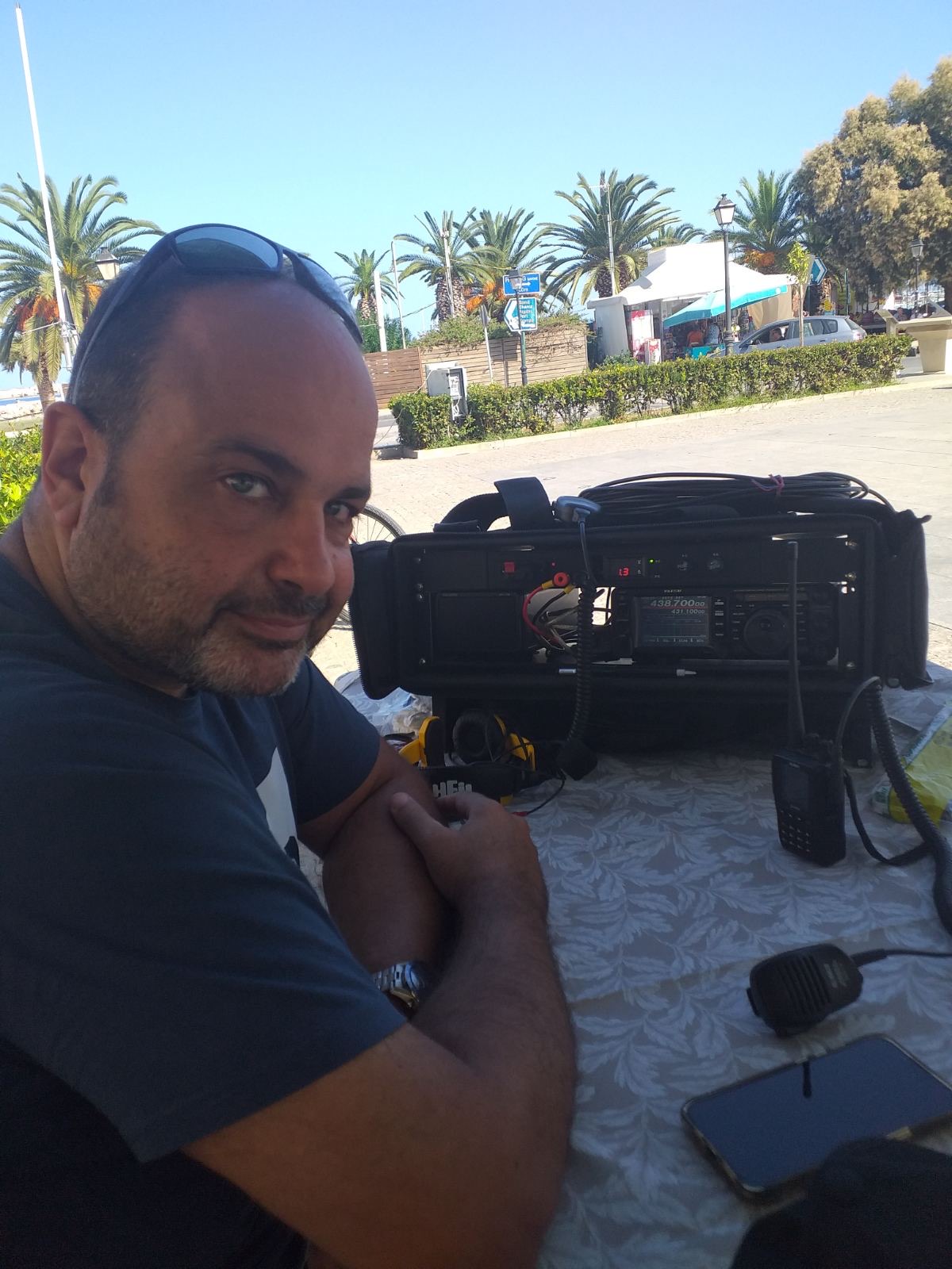 With the help of my friend Nikos SY9EES, we set up our base in the town square, with the Radio Carrying Case containing a Yaesu 991A Radio Transreciever with Tuner and power supply, while we also installed a dipole antenna for the HF bands of 40m and 20m, as well as a Diamond antenna for the VHF and UHF bands.
